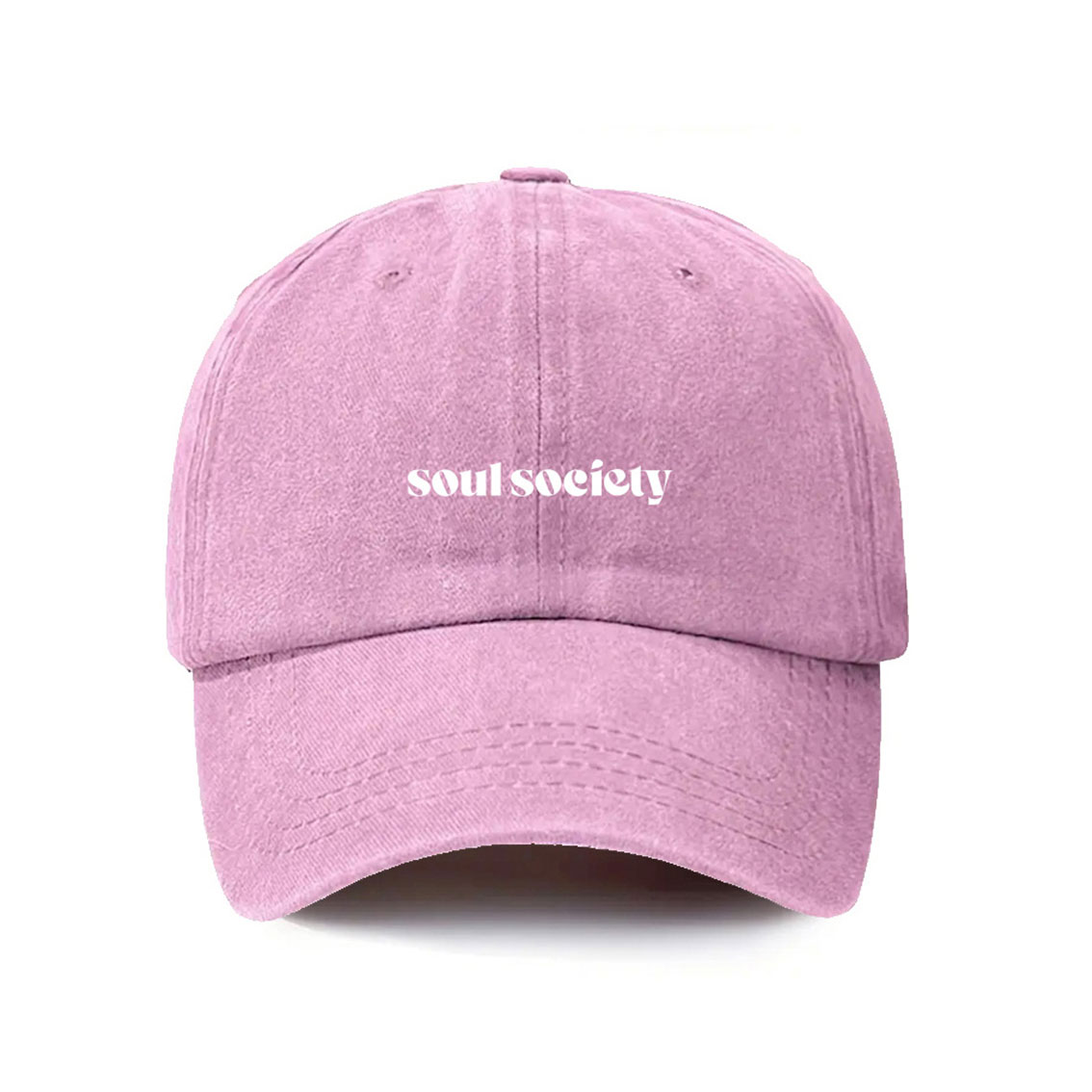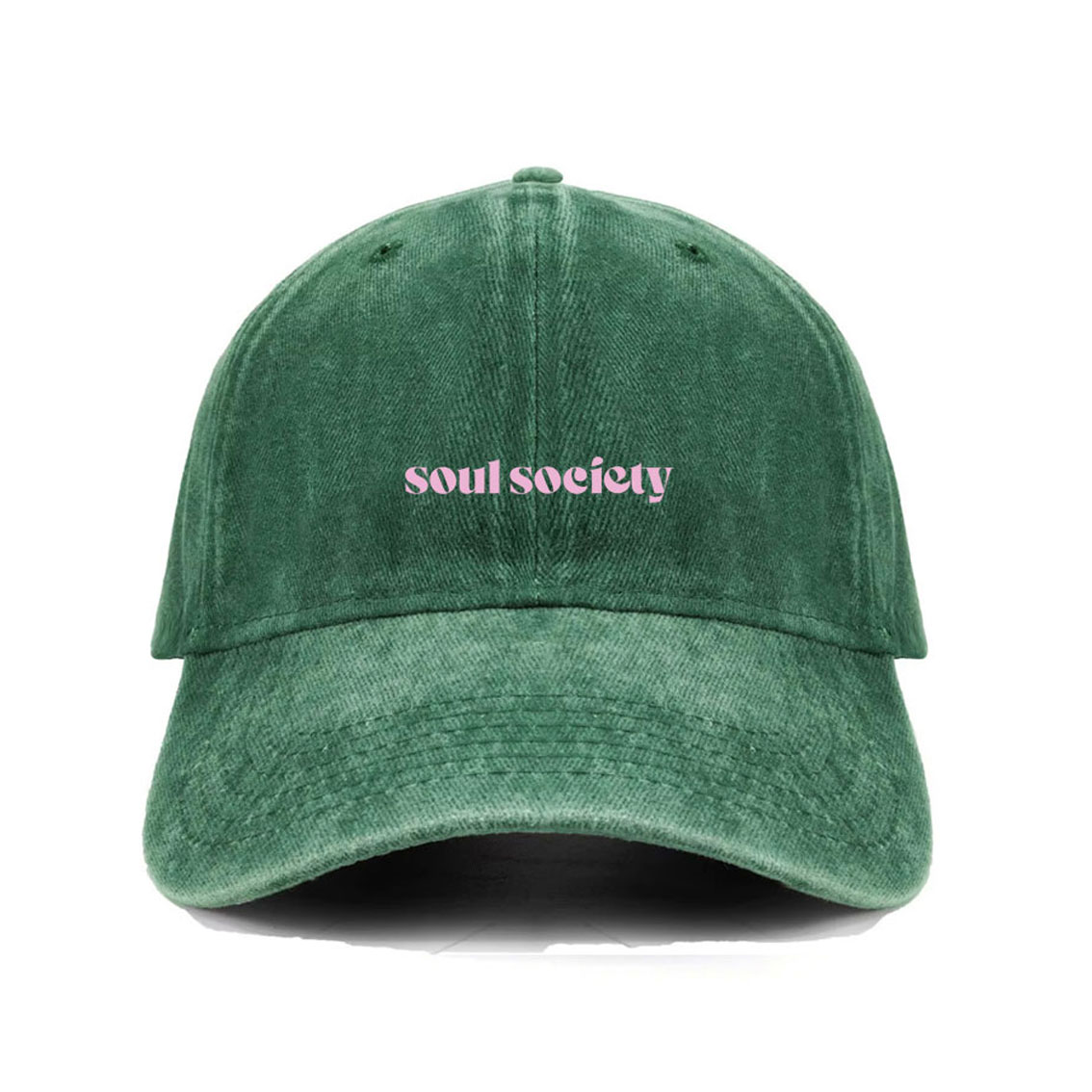Distressed SS cap. Strap back with buckle clasp. Options include stacked or horizontal in the maroon and horizontal in the pink, green and cream.