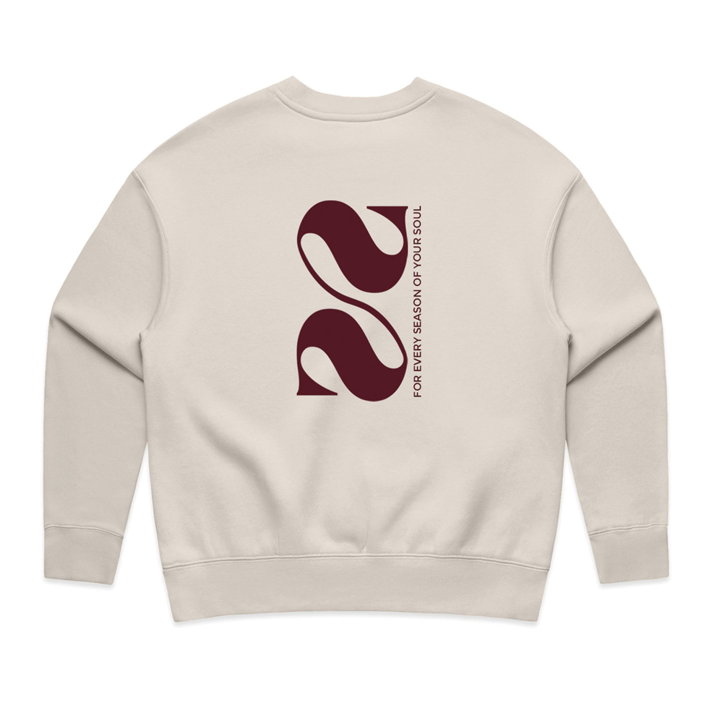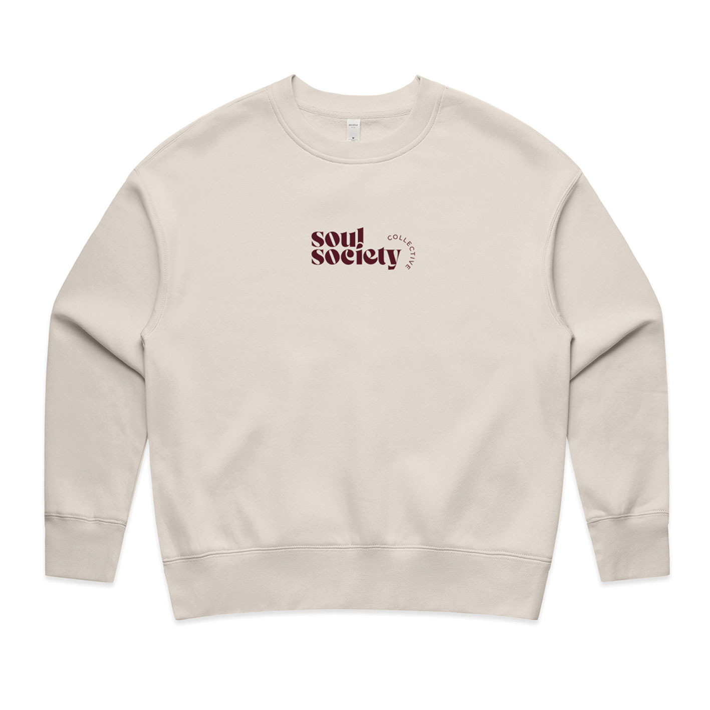 Super comfy crew fit jumper. Fleece inside. Branding front and back. Comes in cream with maroon graphics.